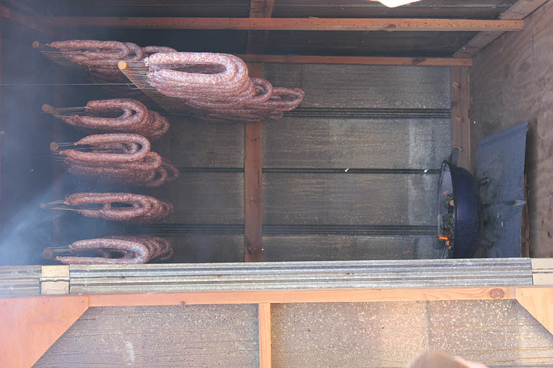 Step 5: Hang the tied sausage links on a stick and place them in the smokehouse. {My husband built the smokehouse last year just for this annual sausage making day.}